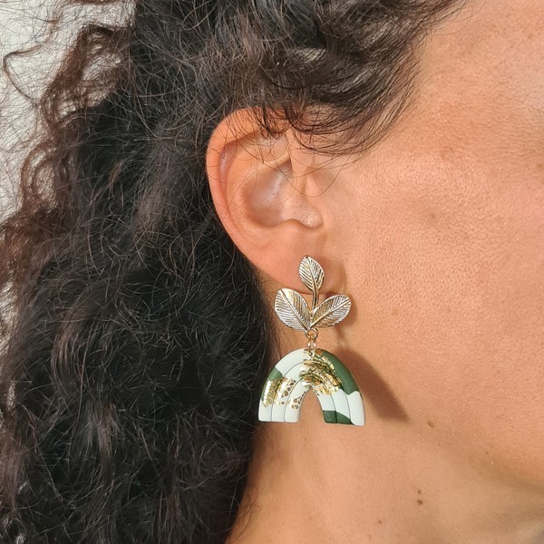Ajoutez une touche d’élégance naturelle à votre look avec ces boucles d’oreilles réalisées à la main, mêlant pâte polymère aux motifs verts et blancs et feuilles dorées, associées à un pendentif en laiton doré végétal.
