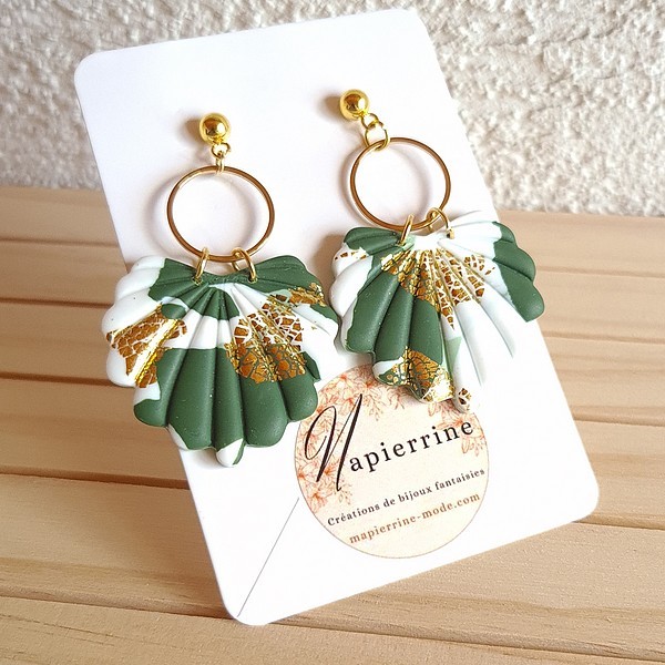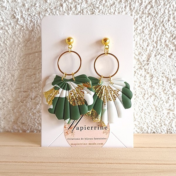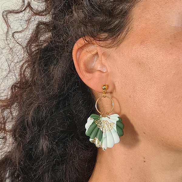 Chaque paire est composée d’un éventail sculpté en pâte polymère aux nuances vertes, blanches et touches de feuille dorée, monté sur des anneaux en acier inoxydable doré.