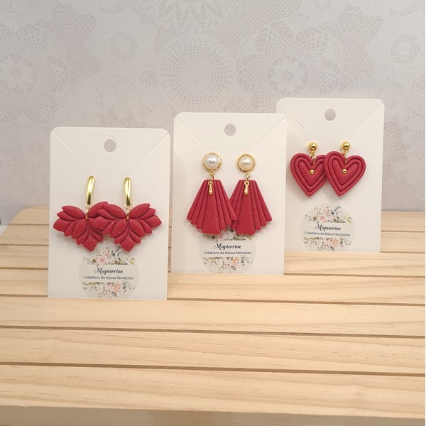 Trois modèles féminins : éventail sculpté, pendants cœurs torsadés, fleurs graphiques.