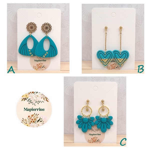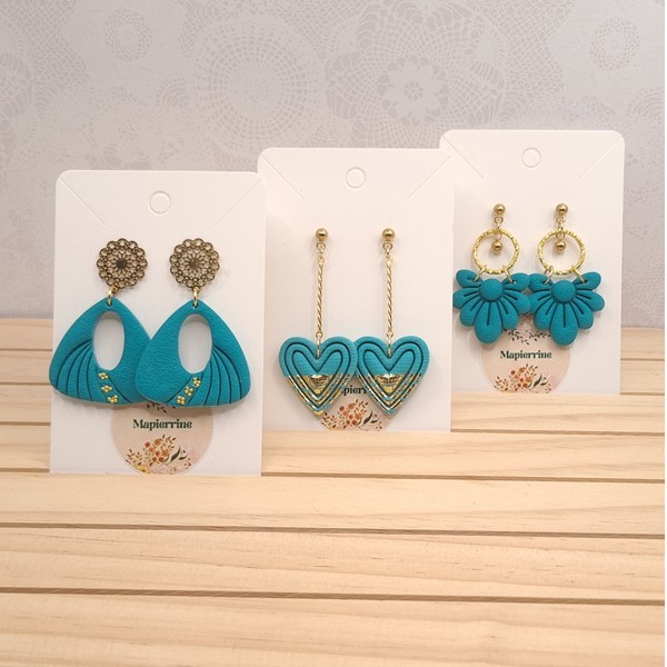 Chaque modèle revisite la pâte polymère sous des formes graphiques : effet éventail, cœurs texturés ou marguerite stylisée bleu turquoise.