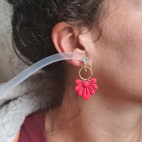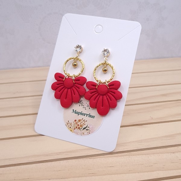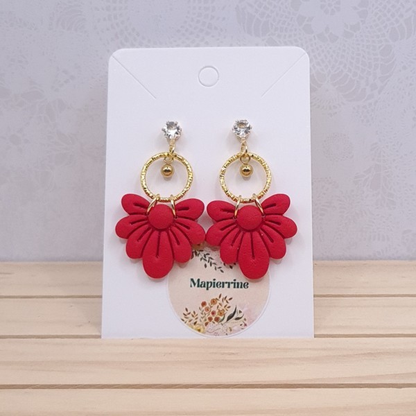 Elles associent la pâte polymère pour la partie fleur (coloris rouge, finition mate, détails sculptés) à une structure en acier inoxydable doré, résistante et hypoallergénique. Un strass apporte une touche d’éclat à chaque boucle, pour un look raffiné et moderne.
