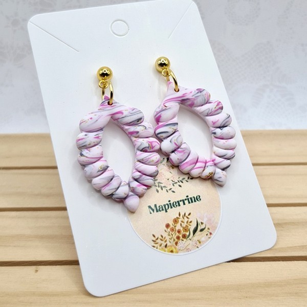 Légères et originales, ces boucles d’oreilles artisanales en pâte polymère marbrée rose, grise et blanche apporteront une touche douce et féminine à toutes vos tenues.