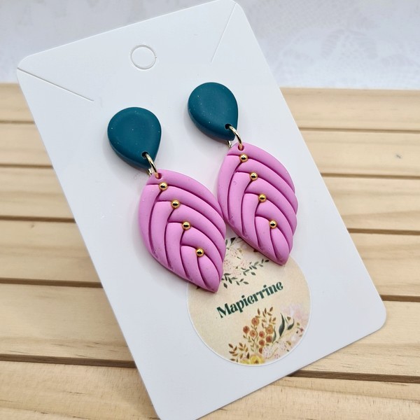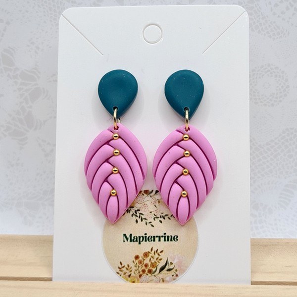 Matériaux : Pâte polymère cuite (rose texturé et turquoise mat), acier inoxydable doré (résistant à l'oxydation).