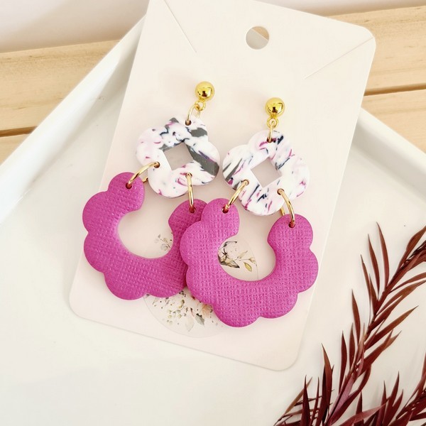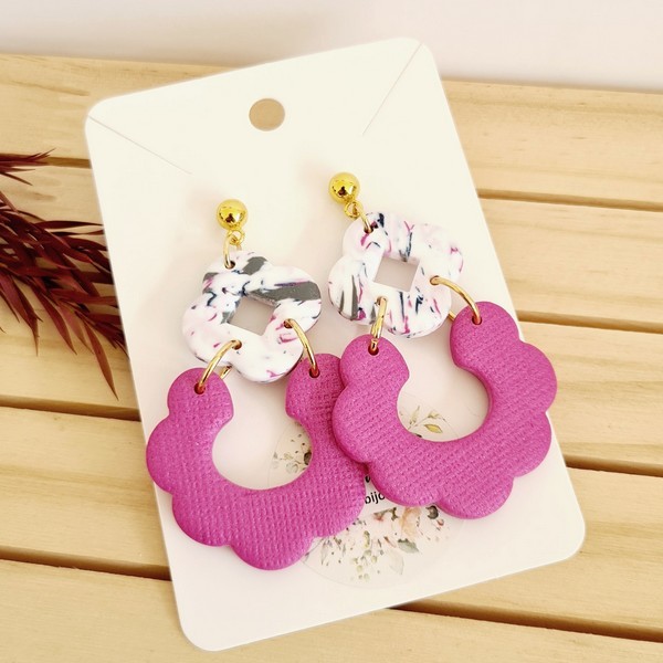 Style : pendentifs légers, forme fleur, coloris rose + marbré, finitions dorées.