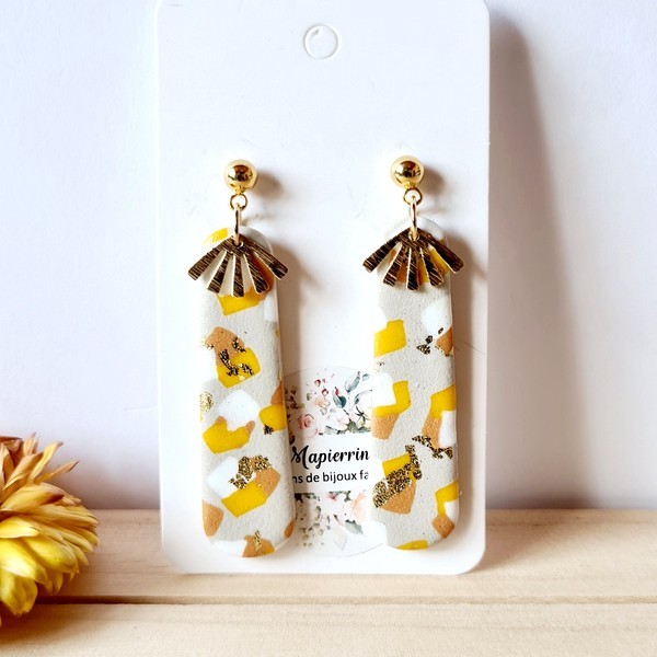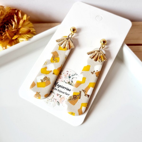 Des boucles d’oreilles artisanales qui sentent bon le soleil : une forme goutte élancée en pâte polymère, sur fond taupe clair, rehaussée de motifs géométriques jaune moutarde et de touches dorées pailletées.