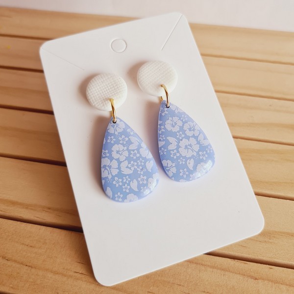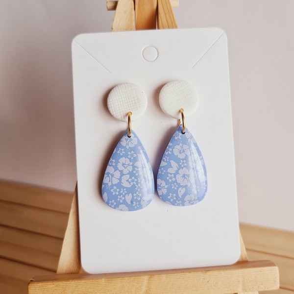 Les pastilles rondes blanches texturées en pâte polymère soutiennent de jolies gouttes bleu pervenche, décorées de fleurs blanches obtenues grâce à la technique du pochoir pour un motif fin et régulier.