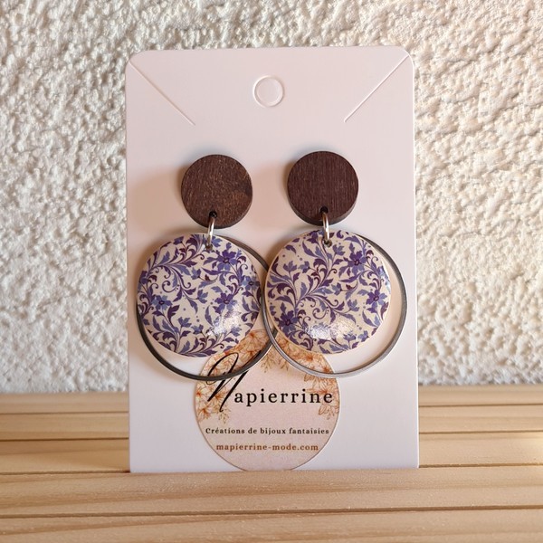 Boucles d'oreille ronde pendante en bois et acier inoxydable argenté 25 mm RAMAGE BLEU