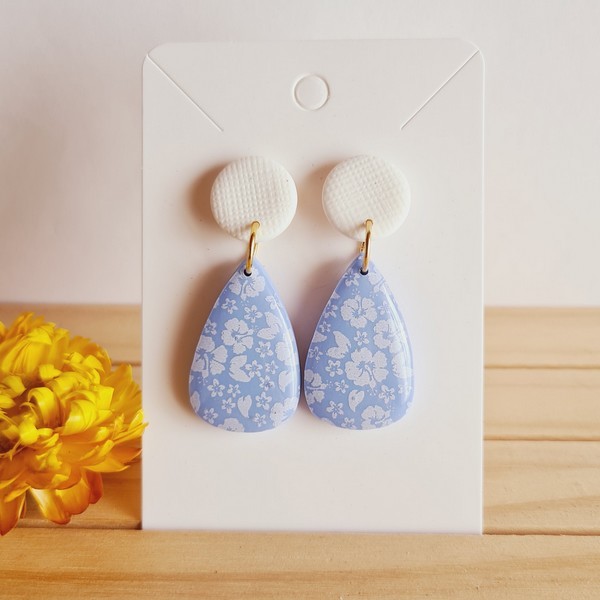 Boucles d’oreilles goutte bleu pervenche fleuries – pâte polymère & acier inoxydable